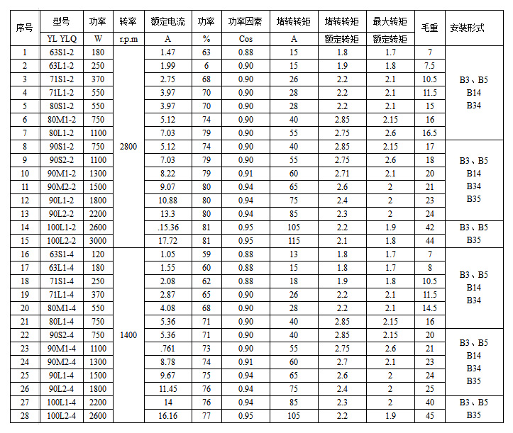 概述 YLQ系列單相雙值電容起動(dòng)異步電動(dòng)機(jī),是我廠吸取國(guó)內(nèi)外同類產(chǎn)品先進(jìn)技術(shù)進(jìn)行優(yōu)化設(shè)計(jì)制造的具有高起動(dòng)轉(zhuǎn)矩的單機(jī)雙值電容異步電動(dòng)機(jī)。該系列電動(dòng)機(jī)具有動(dòng)動(dòng)轉(zhuǎn)矩大,功能指標(biāo)高,動(dòng)行可靠,維護(hù)方便等特點(diǎn)。,符合國(guó)際電委員會(huì)推薦標(biāo)冷中的有關(guān)規(guī)定,廣泛用于小功率機(jī)械傳動(dòng)設(shè)置 系統(tǒng)產(chǎn)品中:63、71和80機(jī)座的2極安裝形式為B3、B5、B14、B34。80機(jī)座的4極和90機(jī)座為B3,B5,B14,B34,B35。該系列電機(jī)為連續(xù)工作制,電源頻率為50Hz,電壓為220V 結(jié)構(gòu)物點(diǎn) YLQ系列電動(dòng)機(jī)為全封閉式結(jié)構(gòu),外殼防護(hù)等級(jí)為IP44,冷卻方式IC0141,B級(jí)絕緣,接線盒在電機(jī)上部。 1:B3型:機(jī)座帶底腳,端蓋上無凸緣。 2:B5型:機(jī)座不帶底腳,端獸上有大凸緣。 3:B14型:機(jī)座不帶底腳。端蓋世無上有小凸緣。 4:B34型:機(jī)座帶底腳,端蓋上有小凸緣。 5:B35型:機(jī)座帶底腳,端蓋上有大凸緣。 性能指標(biāo)