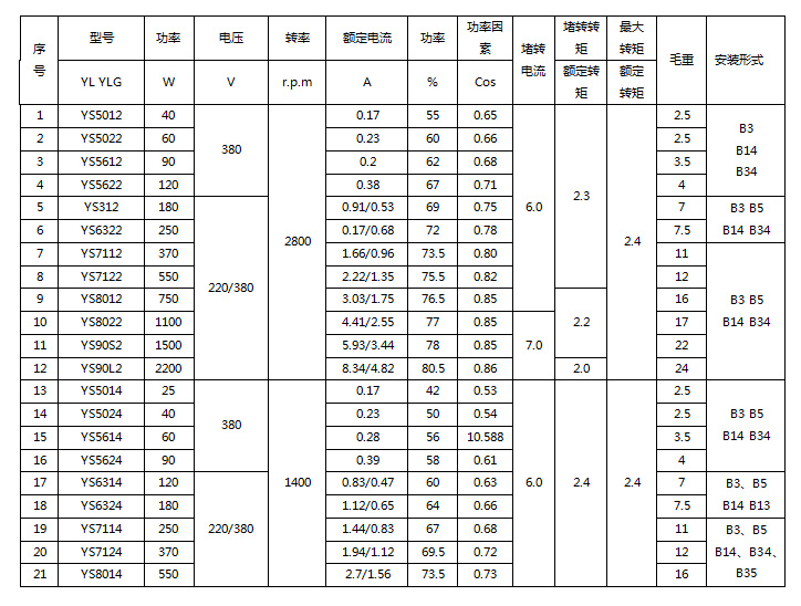 概述 YS系列相三相異步電動機(jī),本系列電動機(jī)按照中國最新標(biāo)準(zhǔn)并吸取國際上同類產(chǎn)品優(yōu)點(diǎn)設(shè)計制造。具有動動轉(zhuǎn)矩大,功能指標(biāo)高,動行可靠,維護(hù)方便等特點(diǎn)。,符合國際電委員會推薦標(biāo)冷中的有關(guān)規(guī)定,廣泛用于小功率機(jī)械傳動設(shè)置;衁S80、TS90、YS100的B5型、B3型、B35型。其外形尺寸、安裝尺寸極其性能指標(biāo)和Y系列三相異步電動機(jī)安全相同。 結(jié)構(gòu)物點(diǎn) YS系列電動機(jī)為全封閉式結(jié)構(gòu),外殼防護(hù)等級為IP141采用B級絕緣, IC0141冷卻方式,接線盒在電機(jī)上部或右側(cè)(從軸端看) 1:B3型:機(jī)座帶底腳,端蓋上無凸緣。 2:B5型:機(jī)座不帶底腳,端獸上有大凸緣。 3:B14型:機(jī)座不帶底腳。端蓋上有小凸緣。 4:B34型:機(jī)座帶底腳,端蓋上有小凸緣。 5:B35型:機(jī)座帶底腳,端蓋上有大凸緣。 性能指標(biāo)