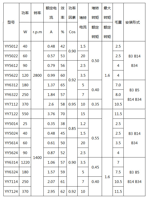 YY系列相三相異步電動(dòng)機(jī),本系列電動(dòng)機(jī)按照中國(guó)最新標(biāo)準(zhǔn)并吸取國(guó)際上同類(lèi)產(chǎn)品優(yōu)點(diǎn)設(shè)計(jì)制造。具有動(dòng)動(dòng)轉(zhuǎn)矩大,功能指標(biāo)高,動(dòng)行可靠,維護(hù)方便等特點(diǎn)。,符合國(guó)際電委員會(huì)推薦標(biāo)冷中的有關(guān)規(guī)定,可以廣泛適用于家用電器、風(fēng)扇、電影放映機(jī)、錄音機(jī)、記錄儀等驅(qū)動(dòng)設(shè)備上。 結(jié)構(gòu)特點(diǎn) YS系列電動(dòng)機(jī)為全封閉式結(jié)構(gòu),外殼防護(hù)等級(jí)為IP44采用E級(jí)絕緣,50、56機(jī)座號(hào)電機(jī)采用IC0041冷卻方式。63及以上機(jī)座號(hào)采用IC0141冷卻方式。接線盒在電機(jī)頂部。其安裝形式有以下五種: 1、B3型:機(jī)座帶底腳,端蓋上無(wú)凸緣。 2、B5型:機(jī)座不帶底腳,端蓋上有大凸緣。 3、B14型:機(jī)座不帶底腳。端蓋上有小凸緣。 4、B35g型:機(jī)座帶底腳,端蓋上有大凸緣。 性能指標(biāo)